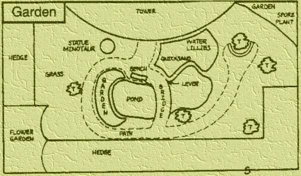 can see a beautiful garden, just as the map shows. There is no one in sight.